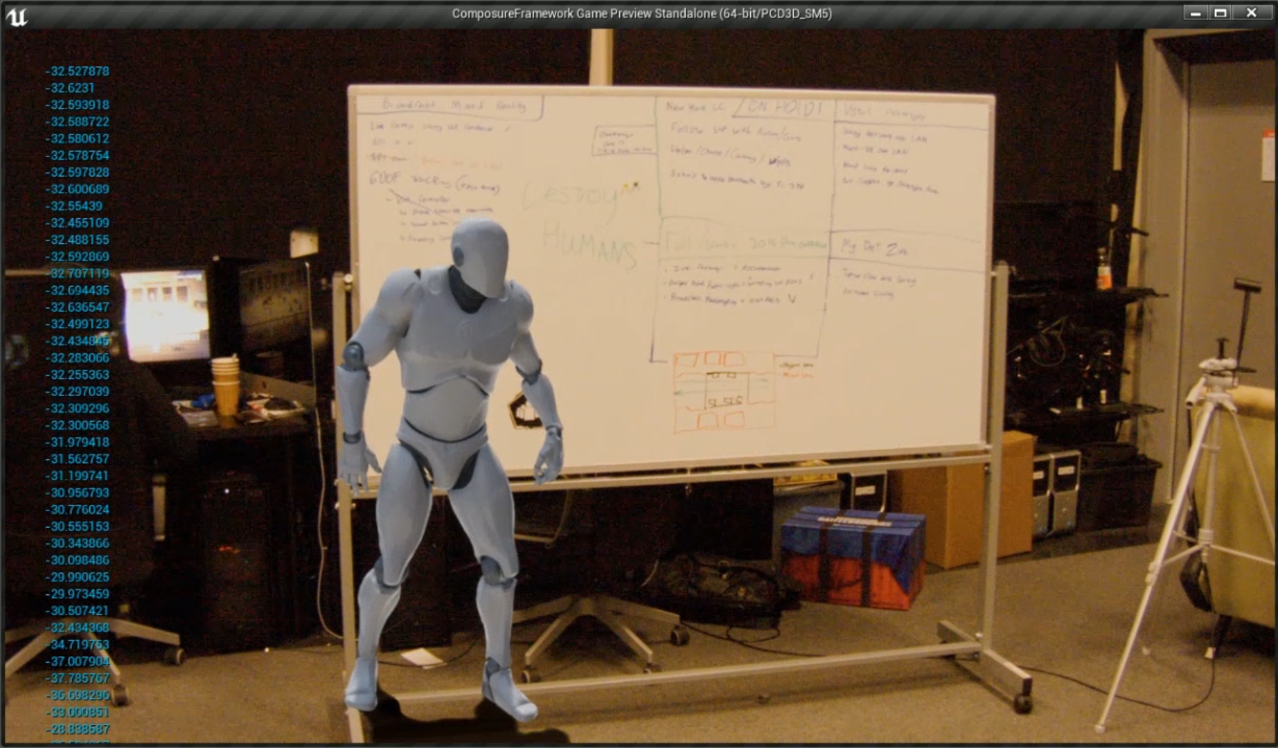 The robot man example is a realtime rendering solution used for the broadcast department of Rooster Teeth. The technology is based on Unreals live rendering features which allow for a 3d object to be superimposed on live video feed.